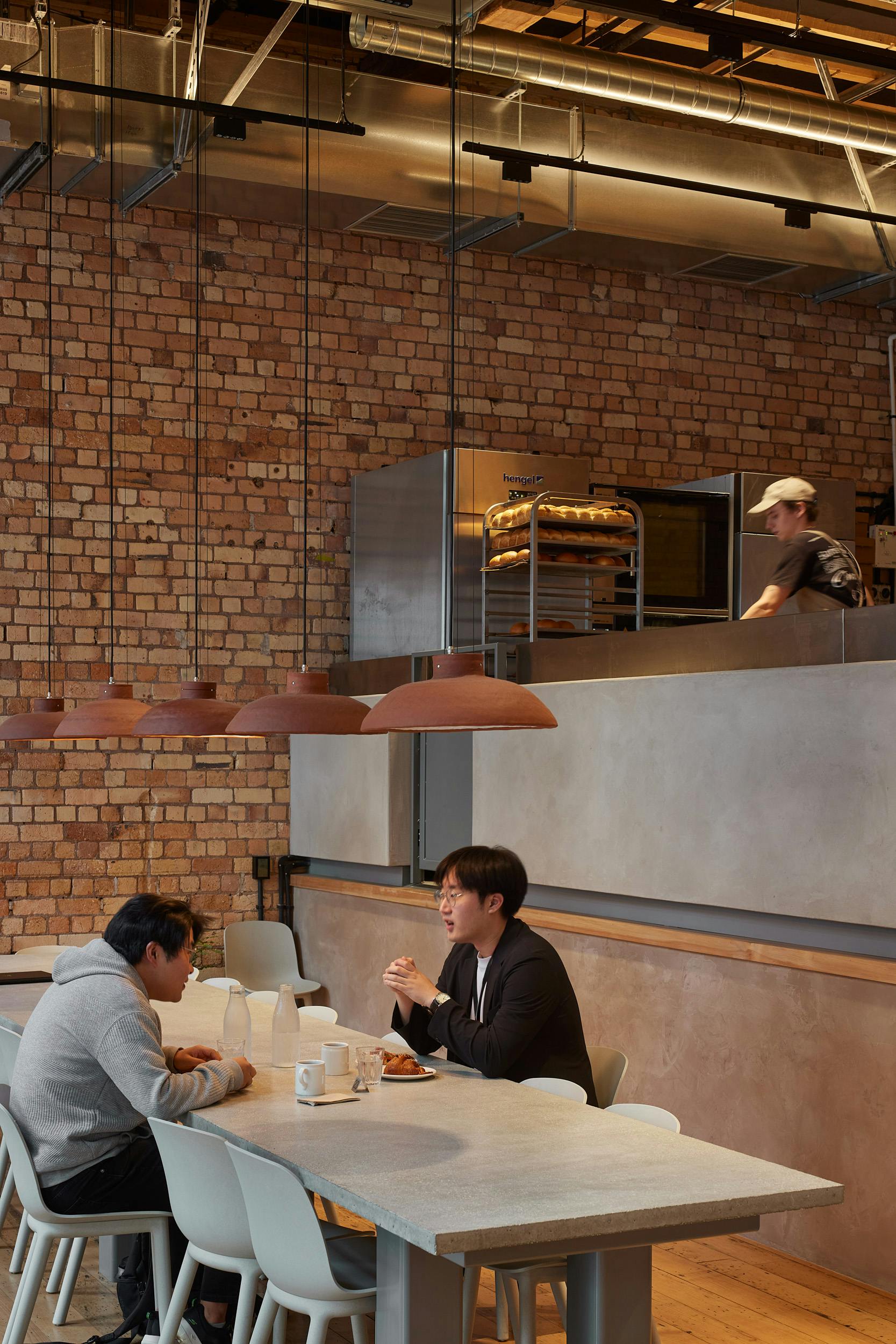 Each design element of the bakery was viewed as an opportunity to translate the client’s prescription of hand crafted, locally sourced ingredients that features across their product range. Lime plaster counters, carefully constructed jarrah leaners, and a heated communal table constructed of local aggregates were inserted into the space. These fixed elements were supported by hand stitched banquette seating, hand-built clay pendants and a custom stacking stool made in New Zealand, specifically for this location.